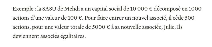 Ci-dessous, je ne suis pas certain que les associés s'entendront en termes financiers car le prix de l'action rapporté au capital me paraît bizarre, non ? (extrait site internet pour aide aux Entrepreneurs)
